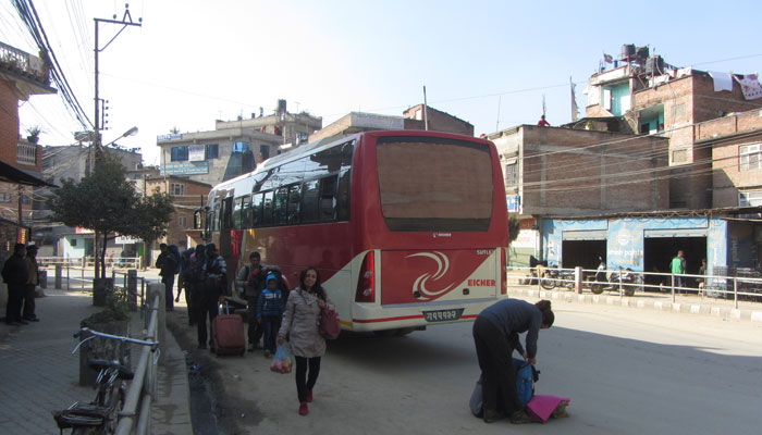 今日も引き続きストが行われているようで、ローカルバスやバイクは動かないようなのだが・・・実はツーリストバスは動いているという情報をゲットしまして。バスターミナルにさえ行ければ、そこからはカトマンドゥまでバスに乗って行くことができるらしい。