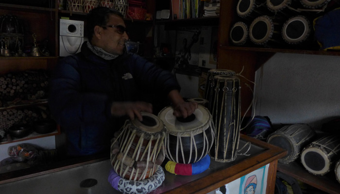 そして、帰り道、たまたま通った楽器屋のおじさんに声をかけられ、店に入ってみると、オイラがインドに行って習いたいって思っていたタブラーが置いてあり、おじさんが見事にタブラーを叩き始めた。これはチャンス、と思ってこれまた撮影させてもらう。