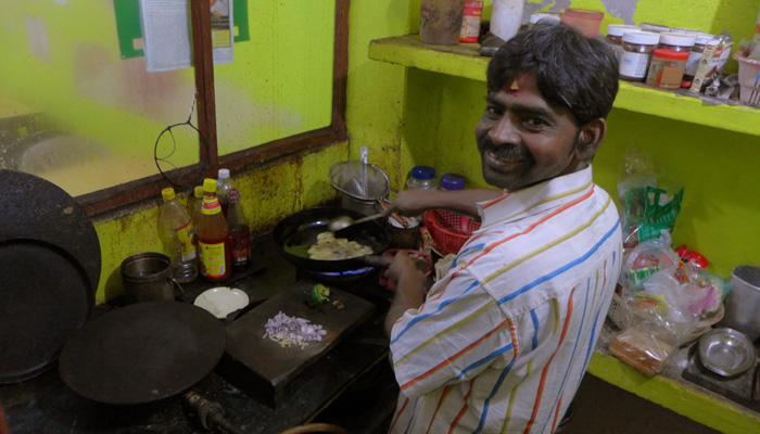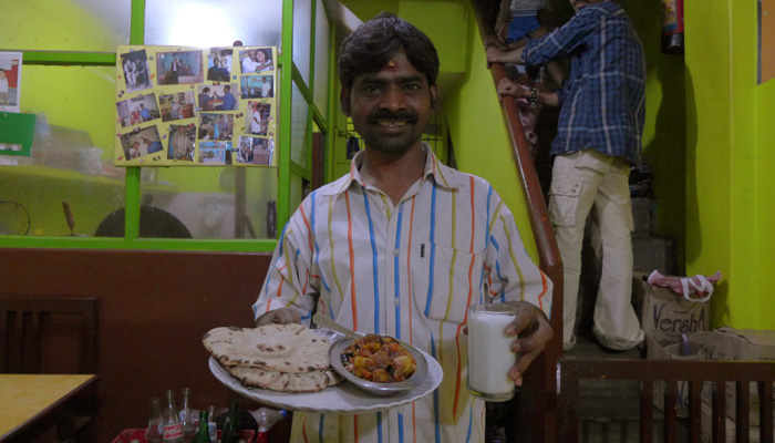そして、夕刻、いつものように、近くのカフェに飯を食べに行く。ちょうど客がオイラだけだったので、これはチャンスと思って、オーダーしたベジカレーを作っているところを覗かせてもらい、レシピを教えてもらうことに。忙しい時間だと邪魔になるだろうから、いつも遠慮してたんですわ。で、お願いしたら、嫌な顔せずOKしてくれて、厨房へ。具材を炒めて、中に入れていた調味料は・・・塩とカレーパウダーだった。うむむ、インドにはカレーパウダーはないと聞いていたのに、安食堂ではカレーパウダーを使っているのねん。そして、料理自体は10分もしないうちに出来上がった。オイラの場合、肉を柔らかくするために煮込み時間をガッツリ取るのだが、野菜だけなら、あっという間にできるんだな。これから自炊する時は、こんな感じの簡易料理でやったらいいかも。カレー作る時は、なんだか仰々しく考えちゃって、それであるがゆえに、たまにしかやらなくなっちゃうから。10分でできるくらいの簡単料理って割り切っちゃえば、すぐにできるもんでしょ。