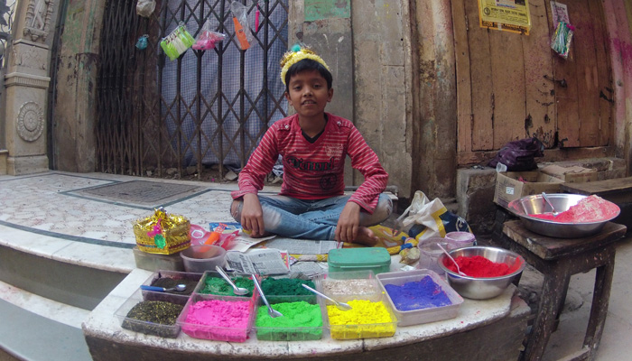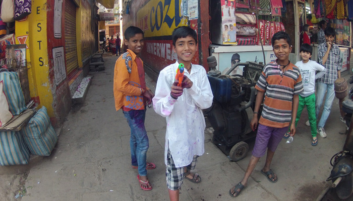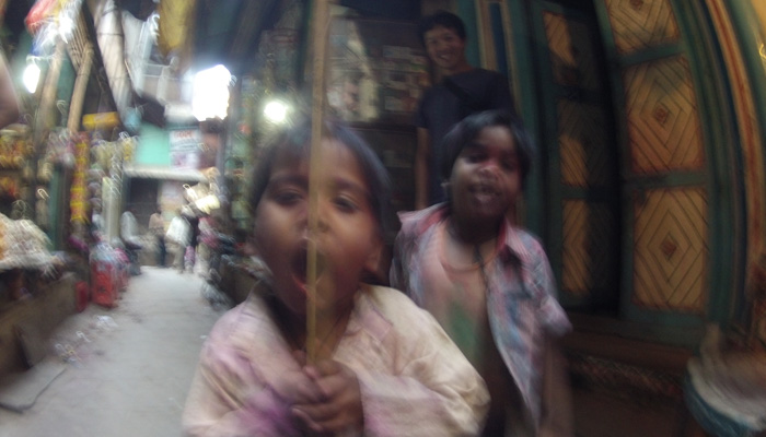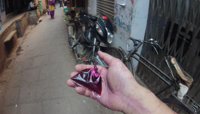 とりあえず、最悪外に出ないという選択肢もありうる、と考え、ホーリー中は宿に籠れるだけの食糧を買いだししておくことに。で、その最中、ベンガル・トラの通りを歩いていたら・・・水鉄砲を持った少年たちから水攻撃を受けた。中身は、ただの水ではなく、色水。そう、ホーリーとは、色粉や色粉を溶いた水を掛け合う<色祭り>。今日はまだ前日なのに、気分が盛り上がった少年たちが、フライングで攻撃をしかけてきたのだ。