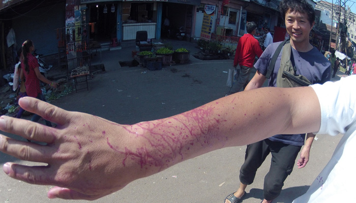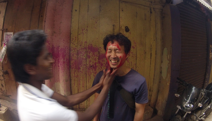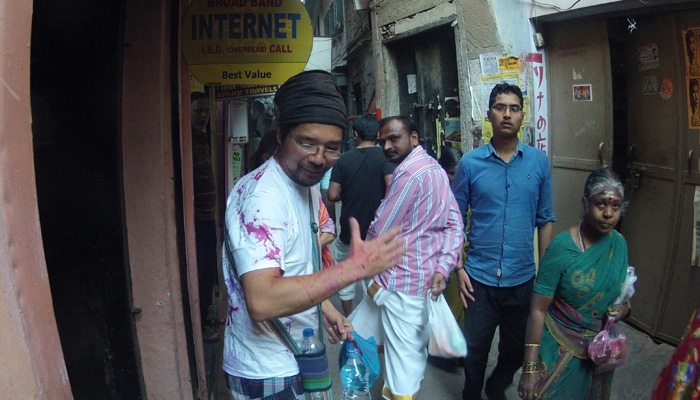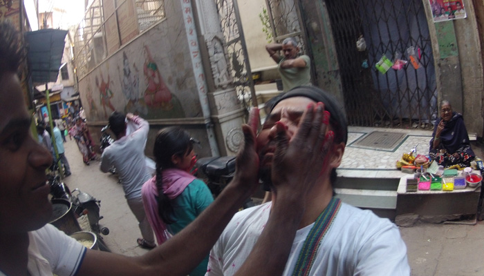 実は、レッスン後、宿に戻る際に、一人の少年から水風船攻撃をくらって、普段着を色まみれにされてしまっていたオイラ。今日からもうヤバいんか、と慌てて、ホーリー用に買っておいた安いTシャツとズボンに履き替えていたので、もはや何をされても大丈夫な状態になってまして。