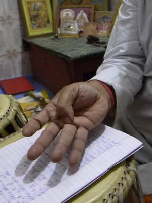 とにかく覚えさせるのがインド流らしい。そういえば、掛け算も100の段まで暗記させられるっていうしな。今、オイラはフレーズをノートに書いてもらっているけれども、本来は、口述伝承が基本とのこと。ノートに書くなんて邪道なのだ。師匠が生徒だった頃は、師匠の師匠が口で言ったフレーズを、ただただ復唱させられるだけのレッスンがずっと続いたという。30分くらいそのまま復唱させられるのだが、師匠の師匠はその間、いなくなってしまう。で、30分後に戻ってきた師匠の師匠が、正しく復唱できているか確認して、間違っていたら木の棒で叩かれたという。