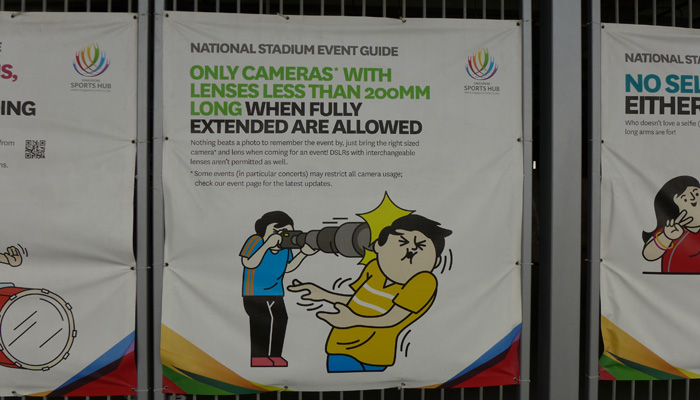 ちなみに、シンガポールはやはり、規則が厳しいところでして。これから開かれるアジアのスポーツ大会向けに、いろいろ禁止事項が書かれた張り紙があってあった。200mm以上のレンズは禁止って・・・そういうことも、ちゃんと明記しているところが、なんか面白いっていうか、行き過ぎだろっていうか。ああ、シンガポールだなぁって思わされる。