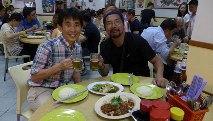チキンライスの美味しい店につれていってもらい、飯とビールを飲みながら、久々の再会に、話が尽きない。同じドラムだったし、音楽話題で盛り上がり、旅のこと、仕事のこと、家庭のこと、学生時代の話、その時の仲間の話・・・旅先で出会う、旅人や現地在住の人とはまた違った話ができるのが楽しかった。