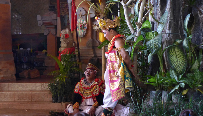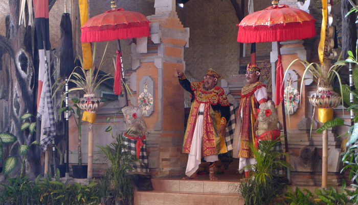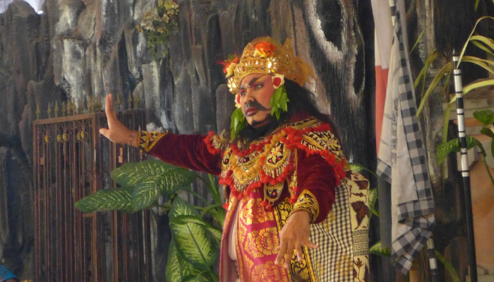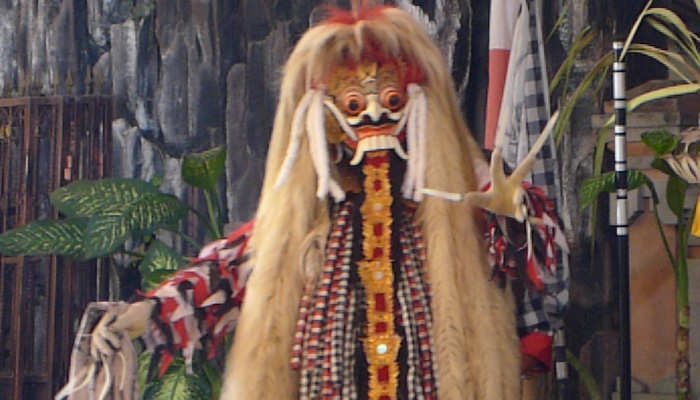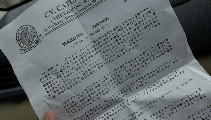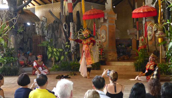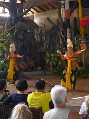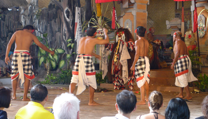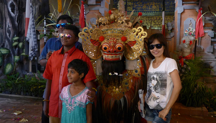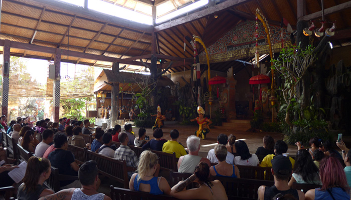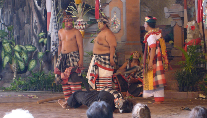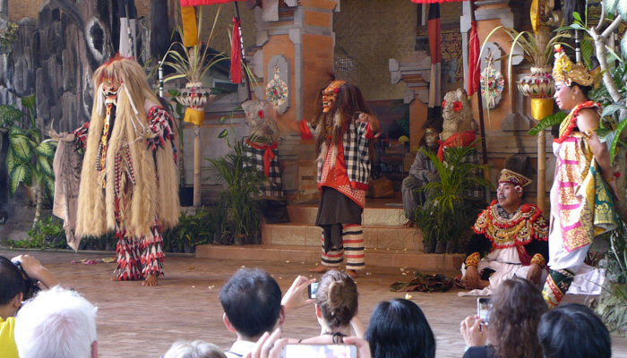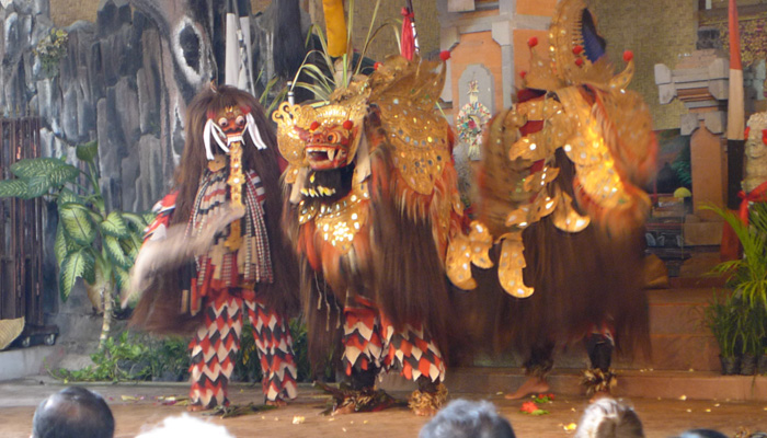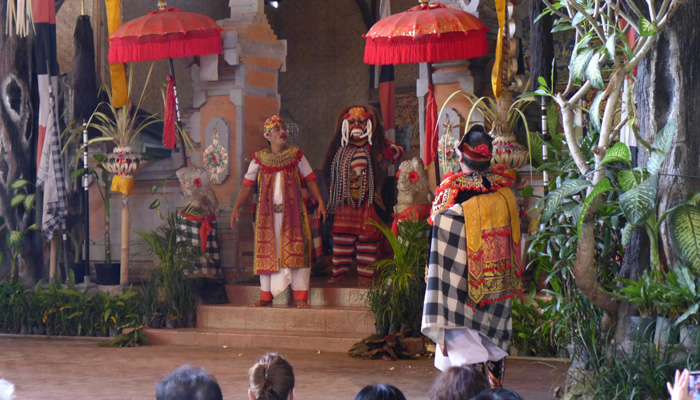 そんなアート道を通りながらのウブドまでのドライブ。まず途中で寄ったのは、バロンダンス。舞踏はアートフェスティバルで見れるものの、バロンダンスはたぶんフェスティバルでは見れないということなので、フェスティバル前に見ておくことに。ちょっと遅れて行ったら、もう席が後ろの方しか空いていなかった。いやぁ、スゴイ人気だ。ちなみに、バロンダンスとは、インドの古代叙事詩<マハーバーラタ>を元にした舞台劇。言葉は分からなくても、原題の話の流れを知っていれば楽しめる。
