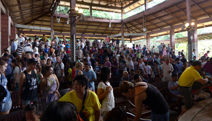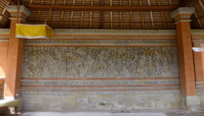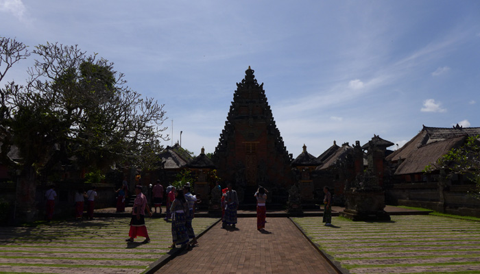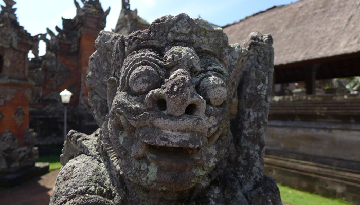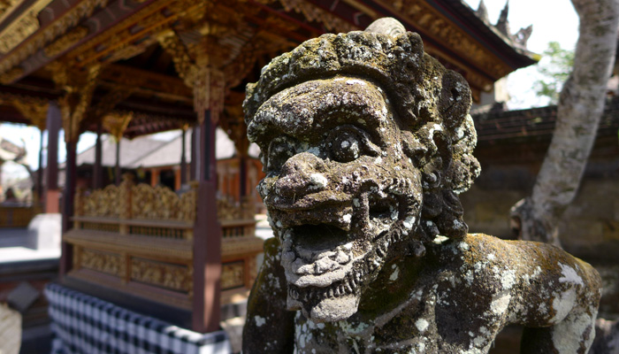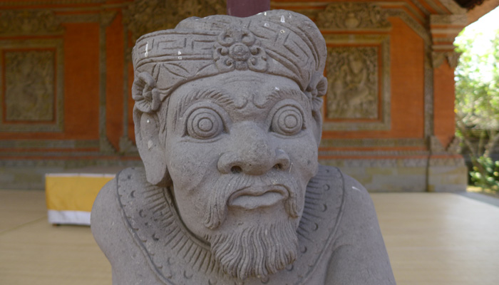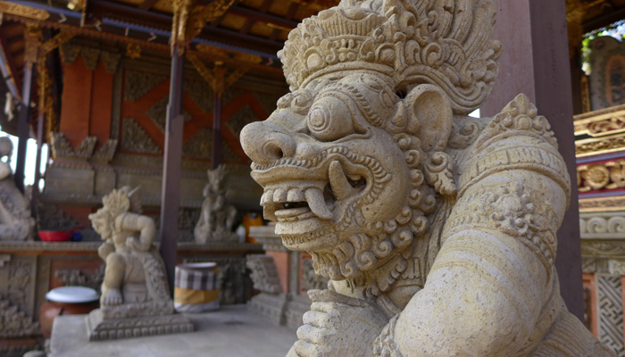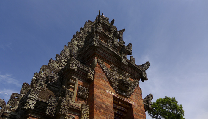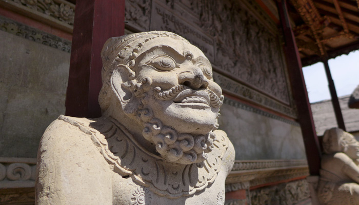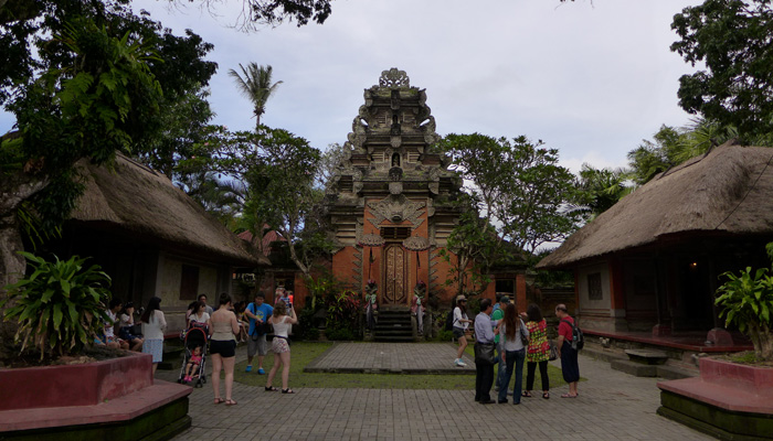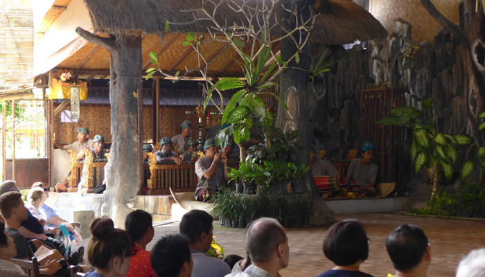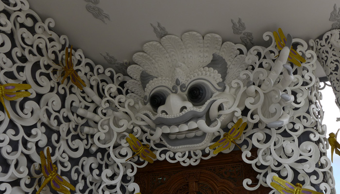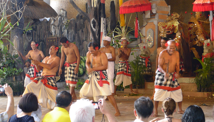 そんなアート道を通りながらのウブドまでのドライブ。まず途中で寄ったのは、バロンダンス。舞踏はアートフェスティバルで見れるものの、バロンダンスはたぶんフェスティバルでは見れないということなので、フェスティバル前に見ておくことに。ちょっと遅れて行ったら、もう席が後ろの方しか空いていなかった。いやぁ、スゴイ人気だ。ちなみに、バロンダンスとは、インドの古代叙事詩<マハーバーラタ>を元にした舞台劇。言葉は分からなくても、原題の話の流れを知っていれば楽しめる。