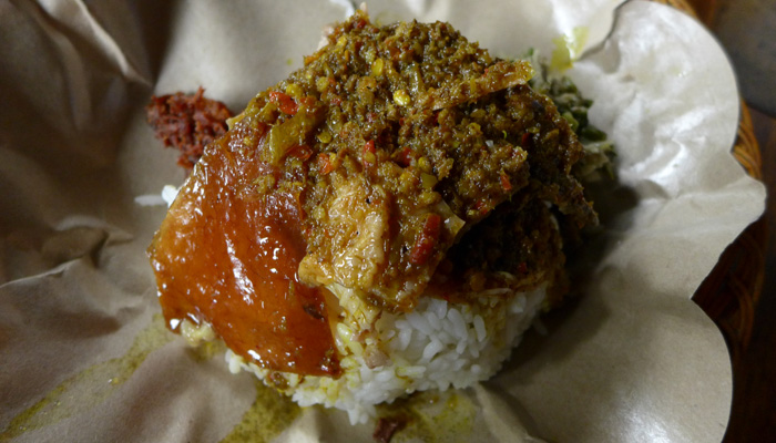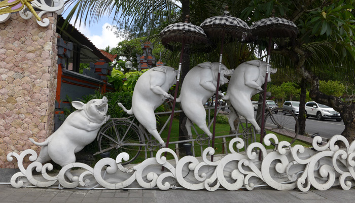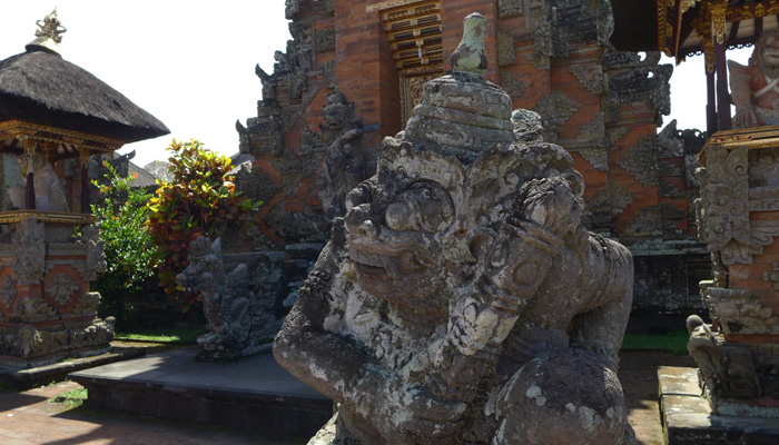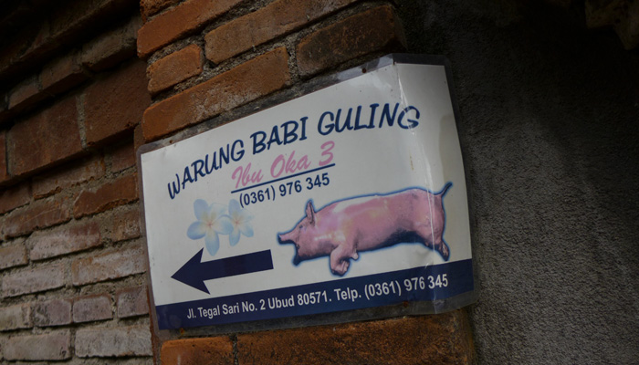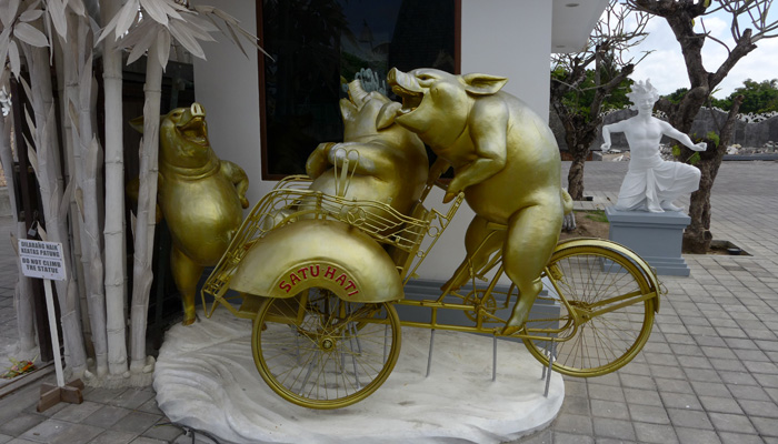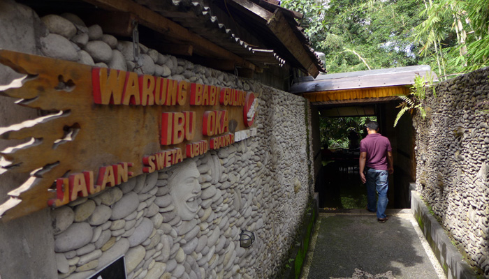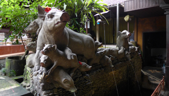 コーヒー店の後は、木細工や石細工などの店がズラリと並んでいるゾーンを抜けたり、寺に寄ったりして、ウブドへ到着。まずは、腹ごしらえということで、バビグリンの店へ。子豚に棒を刺し、グルグル丸焼きにして食べるというバビグリン。調理しているところを見てみたかったのだが、それはかなわず。ただ、出てきた料理はめっちゃ美味かった。いやぁ、バリ島の料理、美味しいなぁ。これは、作り方習いたくなっちゃうよ。