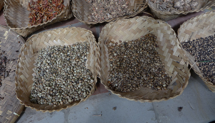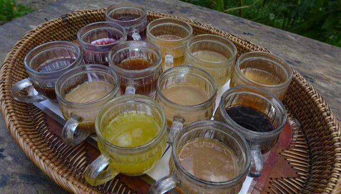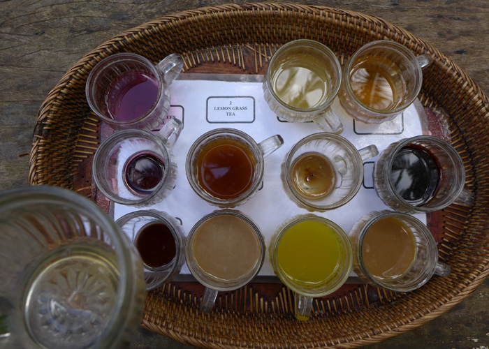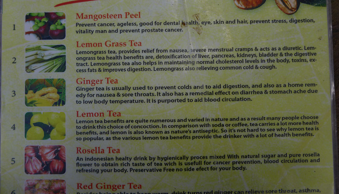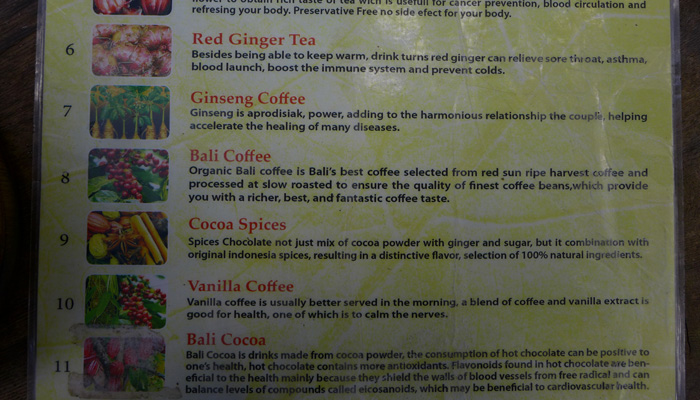 そんなコーヒー音痴なオイラに、朗報が。この店では、ルアクコーヒー以外にも、12種類のハーブティーやらハーブコーヒーを試し飲みさせてくれたのだ。で、その中に普通のジャワコーヒーなるものが入っていて、それと飲み比べたら、確かに芳香がルアクコーヒーの方がいいということが分かるじゃないですか。