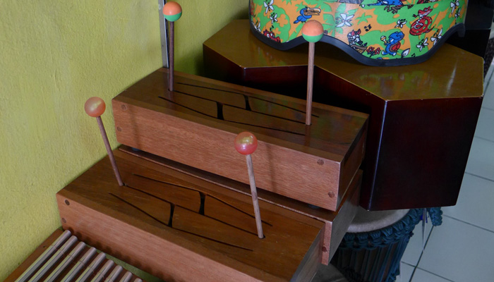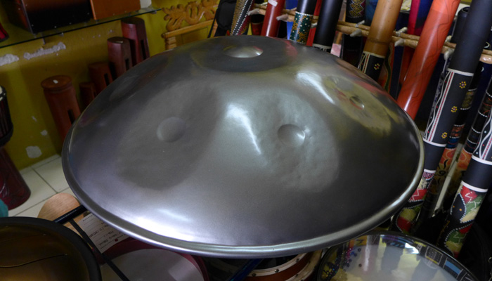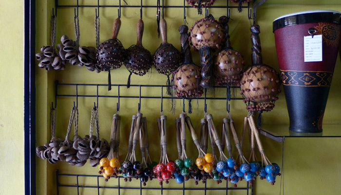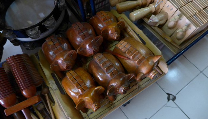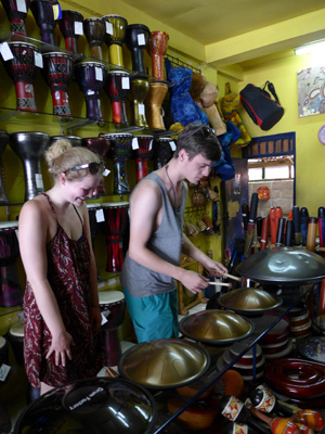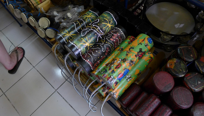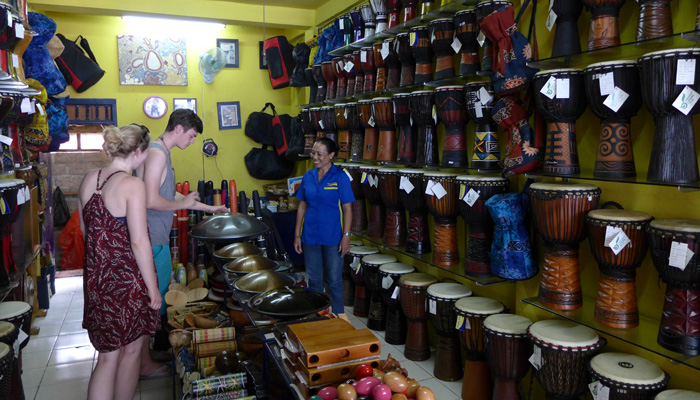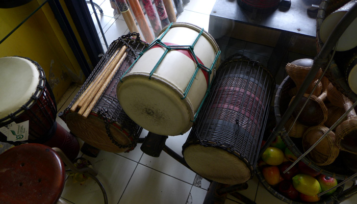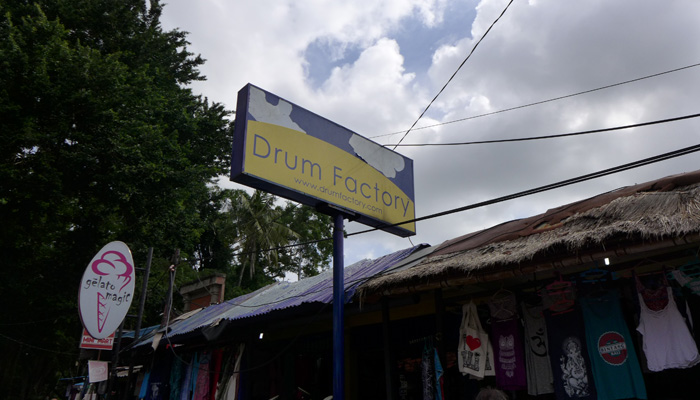 なので、ウブドに来れば売っているだろうと、お土産屋を探しまくったのだが・・・お土産屋にあるのは、ちゃっちいオモチャ楽器だけ。アサラトは全然置いてない。実はないのかなぁ、なんて思いながらモンキーセンター近くまで歩いてきたところに、ドラムファクトリーという打楽器専門店を発見。この店でアサラトを発見できたんですわ。世界各地の打楽器を作っているという。さすが、工芸の地、ウブド。