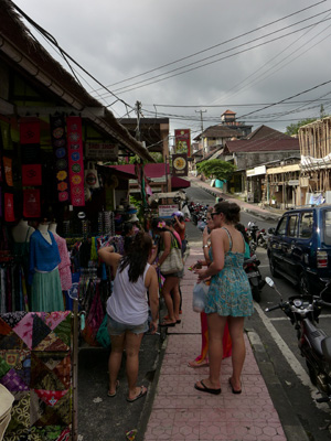 その後、ウブドの街をブラブラすることになったのですが、町の中心は、完全にツーリスティック。ブティックとかスポーツ店とかどこかで見たような店が立ち並び、通りを歩いているのは中国人とか西洋人ばかり。う~む、こういう、観光客しか居ないような場所は、だんだん苦手になってきた。旅で知りたいのは、現地でどんな生活をしているかなのだ。他のツーリストがどんな行動をとっているかではない。