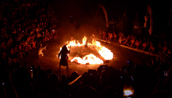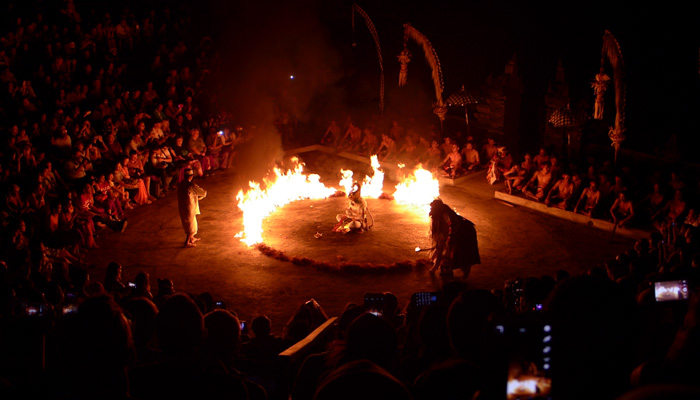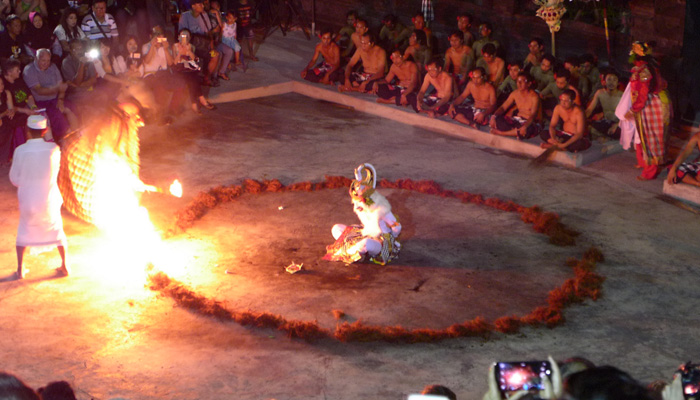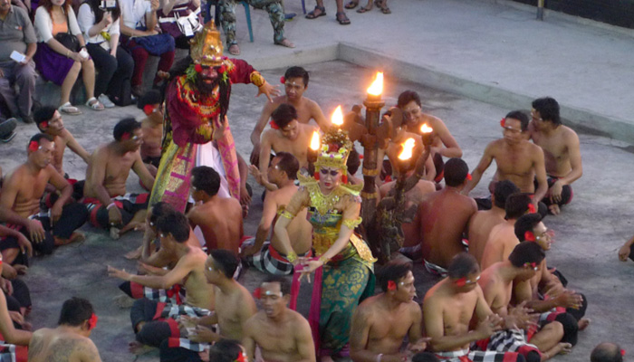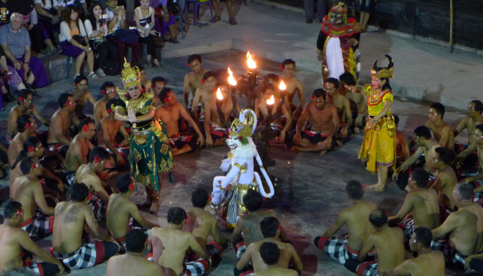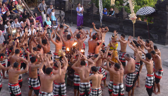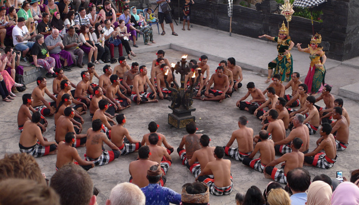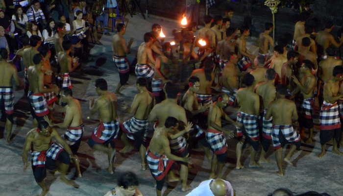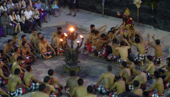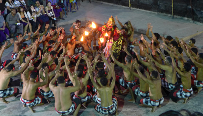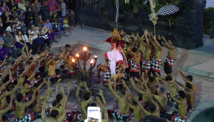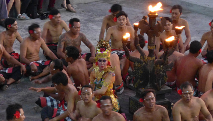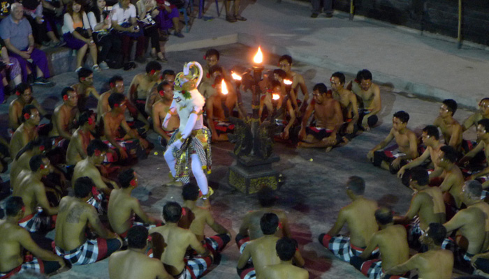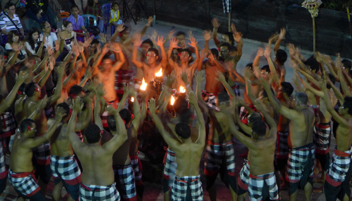 さて、日が沈んだタイミングで始まったケチャダンス。円形舞台の真ん中に上半身裸の男たちが座っている。そんな彼らが「ケチャケチャ」言い始めた。まるで猿の鳴き声だ。ちなみに、ケチャダンス、別名モンキーダンスと言うらしい。