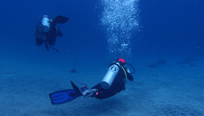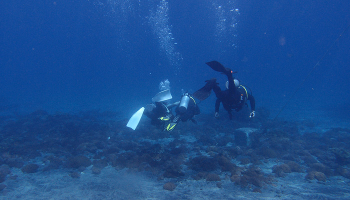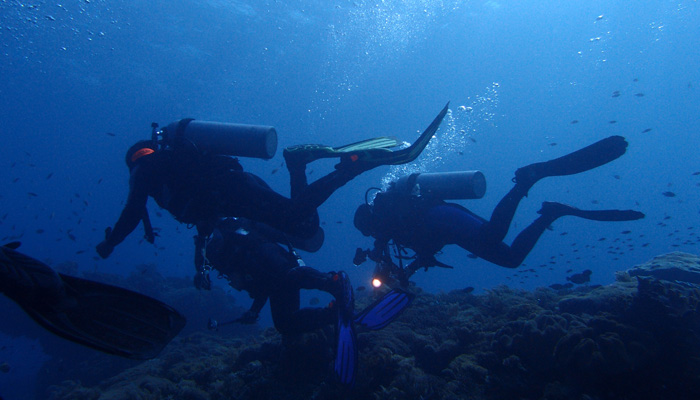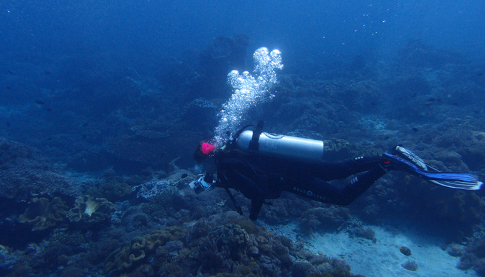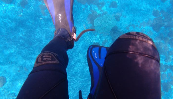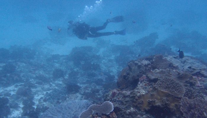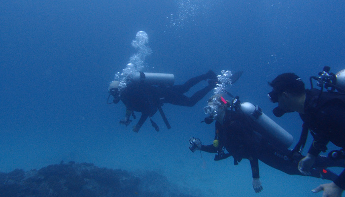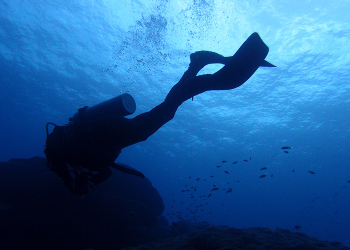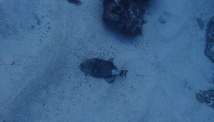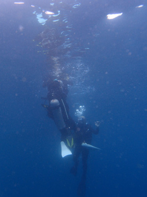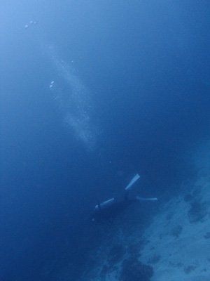 さて、バックロールで海で入り、そのまま潜る。が、いつものように、沈みきれない。6kgも重りをつけてはいるのだが・・・肺を膨らませ過ぎだということは分かっているのだ。だが、いつも大きく息をする癖がついちゃっているオイラ、ダイビングの時だけ肺を膨らませないように息をするってことは出来ない。なので、やっぱり重りを増やしてもらって・・・ようやく降下。