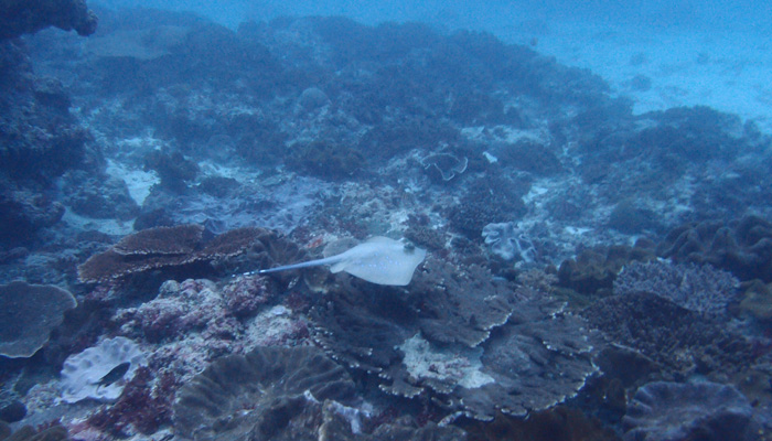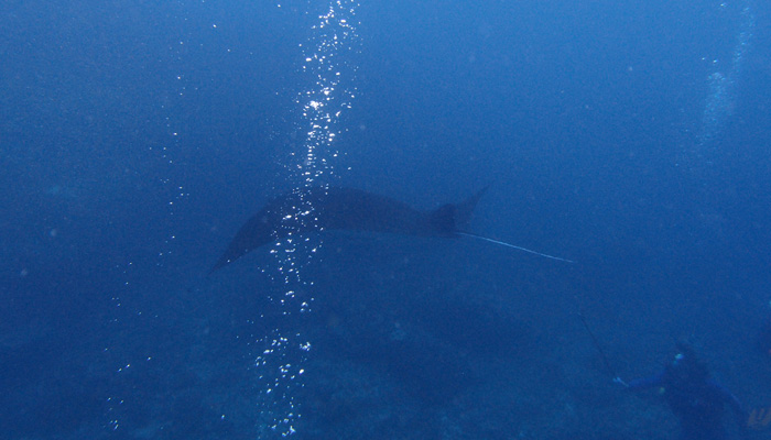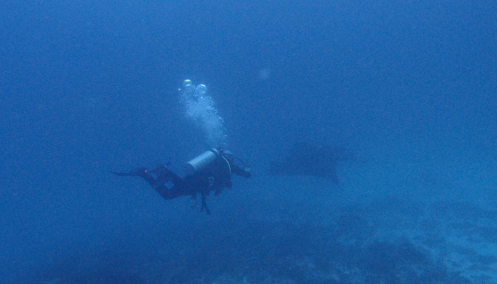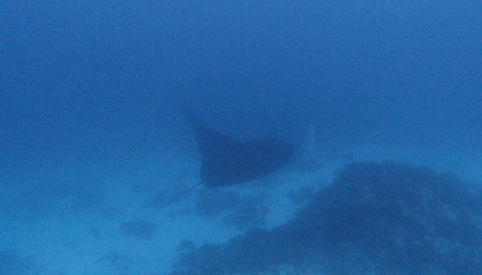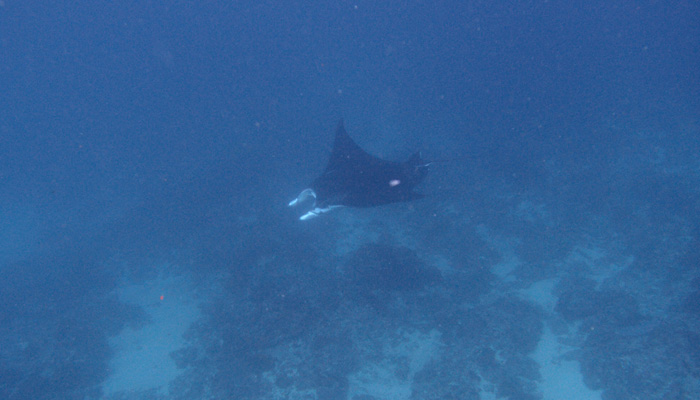 体制を整えるのにアタフタしていたら・・・インストラクターのアリスンが目の前を指さした。その先には黒い影が。なんと、マンタが!しかし、透明度がそんなにないこの海でしかも、結構距離があるため、黒い影としてしか存在を確認できない。近づこうにも、オイラのダイビングテクニックが不足しているため、近づけない。そうこうしているうちに、そのマンタは去って行ってしまった。