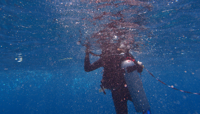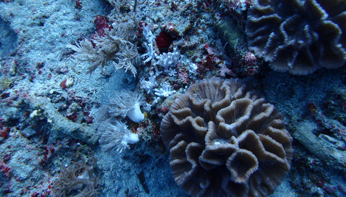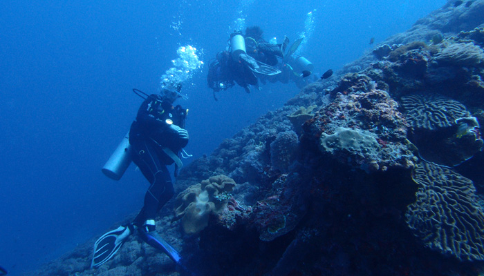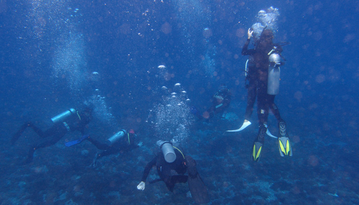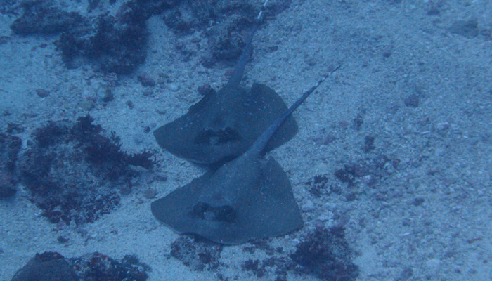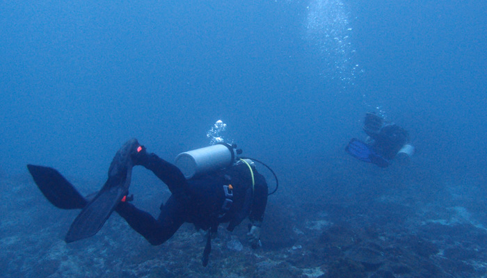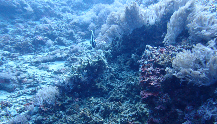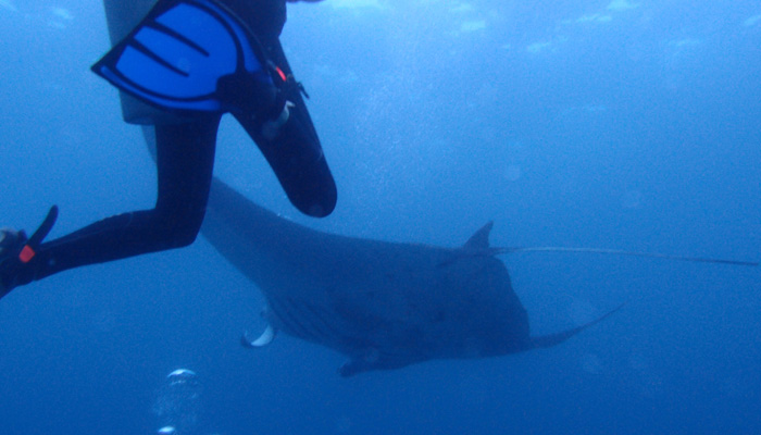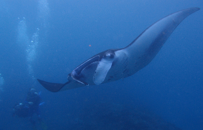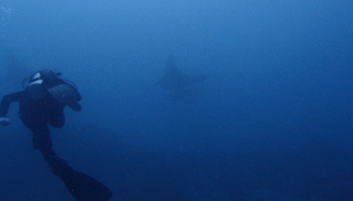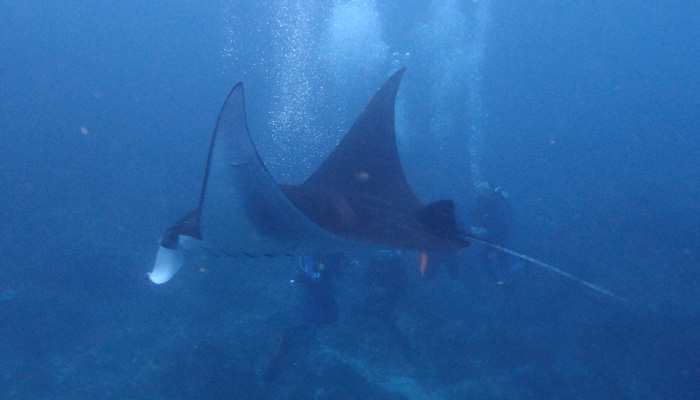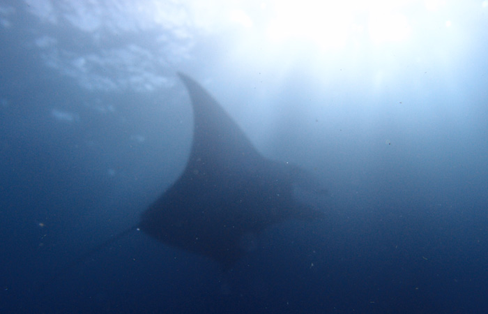 で、海の中は結構潮の流れが強くて、じっとしていると流されてしまうところだった。が、マンタを見るため、じっとしていることを強いられるこのダイビング。ステイ状態が苦手なオイラとしては、なかなか厳しい潜りとなった。