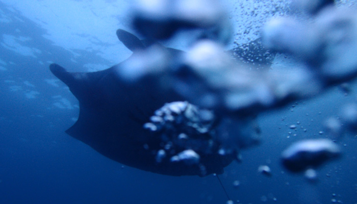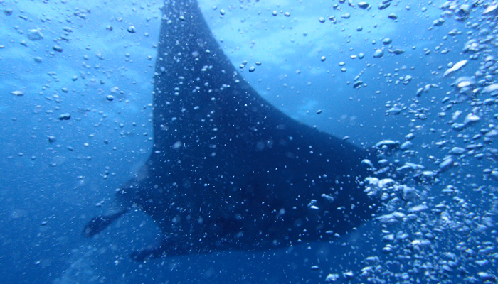 ああ、せっかく逢えたのに、ちらっと見れたってだけで終わっちゃうのか・・・と思っていたら、またもやアリスンが指をさす。今度はオイラの後ろ。振り返ると、なんと背後にドドーンとマンタが出現!