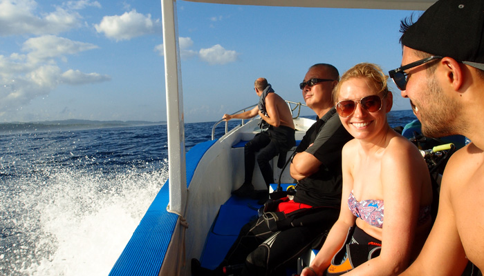スーツやらフィンやらゴーグルの確認をして、ボートに乗り込む。海が綺麗だ。