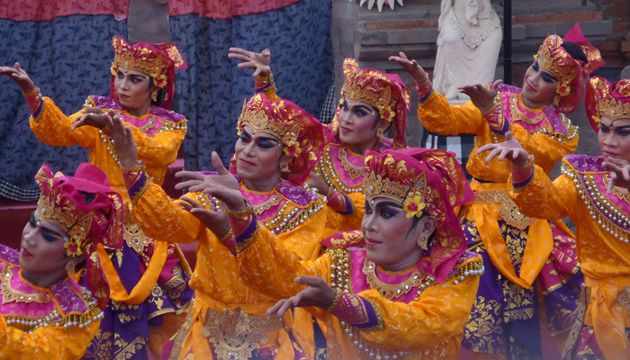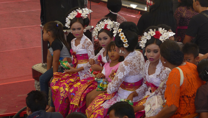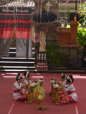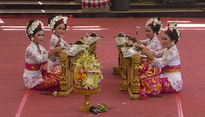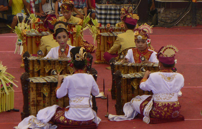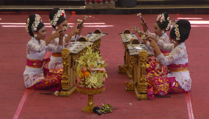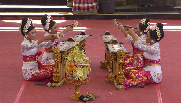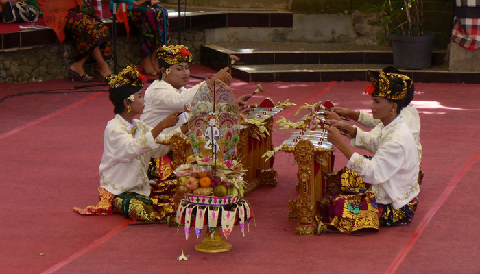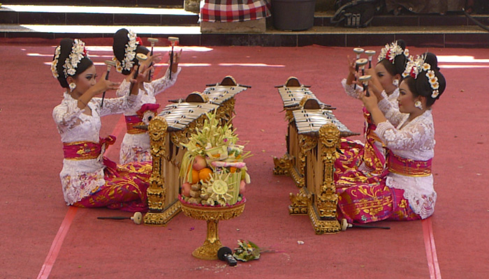今日はなんなんだろう?と思って覗いてみると、ステージには4台のガムランが2セット並べてあるだけだった。いつもなら、たくさんの楽器が並べられているはずなのだが。