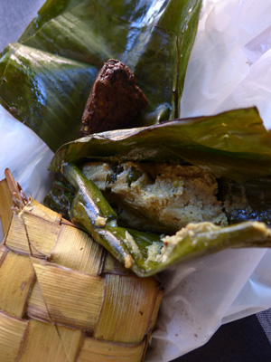 パダン料理は、ご飯にポテトコロッケをトッピングしてソースをかけてもらうというパターンが多かった。これは思いっきり炭水化物だけでしょ。