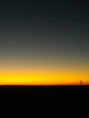 このところ、一日の走行距離を稼ぐため、朝の出発時間を早くしている。目覚ましは朝5:30にセット。外はまだ暗いうちに目を覚まし、出発の準備。シリアルとパンケーキというモーテルの素っ気無いブレックファーストを食べていると、日が昇ってくる。この時間が至福の時。まっ平な大地をシルエットにして、紺色の空と黄オレンジの太陽とのグラディエーション。すばらしい景色です。