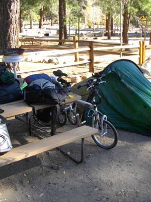 自転車を置いて、Officeを探していると、カートに乗ったおじさん二人が僕の自転車のところで止まり、しげしげと自転車を見ている。そして、僕のほうに近づき、「アレは君のか?」と話しかけてきた。BD-1を知っている人で、雑誌で見て欲しいと思っていたんだと。乗り心地はどうだ?と聞かれたので、エクセレントだよ、と答えておいた。さて、そんなこともありつつ、チェックイン。電気と水がある場所がいいか?無い場所がいいか?と聞かれたので、安い場所がいい、と答えると、電気と水のない$25の場所を指定され、地図を渡される。後は、その場所に行って、どう過ごすのも自分次第。割り当てられた場所には、ベンチと、火を炊く台のみ。水もコンセントも、別棟のランドリールームに行けば使えるので、特に無くても都合悪くはなかった。