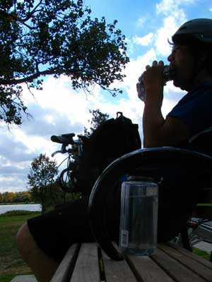 さて、3時間くらいかけて、ようやく昨日のサイクリングロードの入り口に辿り着く。そこから昨日よりかなりゆっくりペースで1時間くらい走ると、見えてきた<White Rock Lake>。でかい、そして確かに素晴らしい眺め。湖の周囲にぐるっとサイクリングロードが続いており、とても気持ちよく走れる。午後のいい時間に辿り着いたので、ここでお昼にすることに。湖のほとりのベンチに座り、朝、台所を借りて作らせてもらったサンドイッチをほおばる。うーん、至福の瞬間だ。