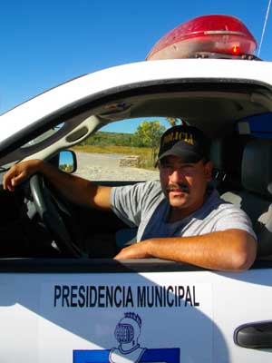 検問所は無事通過し、しばらく走っていると、パトカーらしき車が僕を追い抜き、路肩でストップ。窓を開けて手招きするではないですか。職務質問ざんす。これまたスペイン語で・・・<De donde>と<A donde>と<Emigracion>はお決まりのフレーズ。どこから来たのか?どこへ行くのか?イミグレーションはちゃんとしてあるのか?と検問所と同じコトを聞かれた。その後、ツーリストカードの180日という日付を指し、「6ヶ月もメキシコを回るのか?」らしきことを指をグルグル回しながら聞いてくる。そんなにいるつもりはなかったが、否定して説明するほど語学力がない僕は、「Si」と答えてしまった。それから、「ツーリストならカメラを持っているのか?」と言われたので、ポケットからデジカメを取り出す。取り出したついでに、「FOTO?」と言ったら、ポーズを撮ってくれたので、パチリと写させてもらいました。その後、「道路を走る時には端っこを走れよ、車の運転荒いから」らしきことを道路の路肩の端を指すジェスチャーとともに言って、おじさんは去っていった。