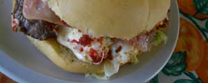 また、結構チーズを使った料理が多いです。そして、このチーズがまた、旨い。パンに牛肉を焼いたものとチョリソとハムと野菜とチーズを入れた豪華バーガー(大きさはビックマックの倍くらいはある)がなんと22ペソ。日本円で180円くらいかな。