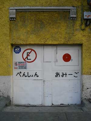 さて、Mexico Cityに入って、目指すはペンション・アミーゴという日本人宿。バックパッカーやサイクリストにはご用達の宿らしく、噂には聞いていて・・・Mexico Cityに行ったらぜひ、泊まってみたいと思っていたんです。事前にネットで検索して、住所からGoogleマップで場所を確認して、手持ちのロードマップに印をつけていたのですが・・・周辺には辿り着けているはずなのに、宿が見当たらない。しょうがないので、近くホテルに入って「ペンションアミーゴという日本人が泊まるホテルを知りませんか?」と聞いたところ、この裏にあるよ、と。裏に回ってみたところ、「ぺんしょん・あみーご」と日本語で書かれた扉が・・・看板などはまったくなく、あるのは、この扉だけ。これじゃぁ、わかんないよぉ、と思いながら、ベルを押すと、中から、日本人らしき女の人が。「泊まれますか?」と日本語で聞いたところ、「ちょっと待ってて」と、言って奥へ。すぐに、奥から管理人の男の人が出てきて、「ようこそ!」と招いてもらいました。