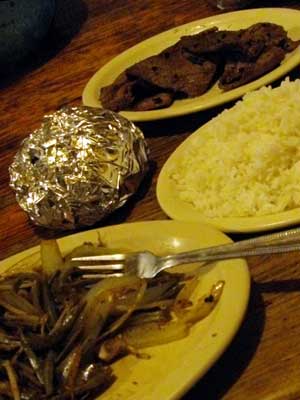 食材を買い終え、アミーゴに戻り食堂へ。早速、米を炊くことにして、一合分米を自前の鍋に入れ、研ぐ。そして、米に対して1.1くらいの割合で水をいれ、30分ほど寝かす。その間に、買って来たサボテンの葉を切り、昨日の残りの玉ねぎを切り、牛の薄切り肉を食べやすいサイズに切り分ける。そして、ちょうど、隣で料理していた人が、にんにくを持っていて、2かけほど分けてもらうことに。
