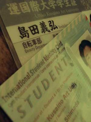 で、学生証の作り方なんですが、まず、日本語のダミー学生証を作るんです。パソコンで作ったダミー学生証データを持って、近くのインターネットカフェに行って、カラーコピー。そして、証明写真を撮って、ダミー学生証に貼り付け、これを持って、文房具屋さんへ。文房具屋で、ラミネート加工してもらうと、それっぽい日本の大学の学生証が完成、と。