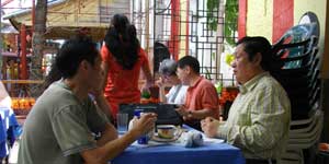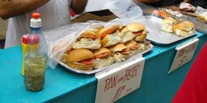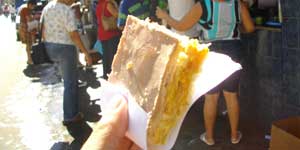 それから、街のどこでもみかけるのが、パン(サンドイッチ)屋。10~15ペソくらいで売っていて、これを片手に食べながら歩いている現地人をよく見かけます。店によって挟んでいる具は違うのですが、大体肉のみ。チーズとか野菜がはさんであるのは、まれですね。ピザのお店もいっぱいあります。その場で釜みたいなので、焼いて(温めて?)くれる店がありまして、いつもすっごい行列が出来ているんです。パン生地にチーズというシンプルなピザで、味気は少ないのですが、塩を少々まぶすといけます。メチャメチャ旨いってもんでもないんですが、ホクホクのチーズがなかなかです。