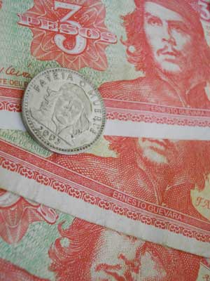 そんなチェ・ゲバラ、こちらの現地ペソの3ペソに肖像画が描かれています。3ペソ札がかっこいい。銀行に行っても入手できるらしいのですが、ペソ払いの食堂で食事をしていたら、お釣りでもらいまして。いつのまにやら、4枚ほど手元に。ちなみに、コインも3ペソコインにゲバラが使われています。