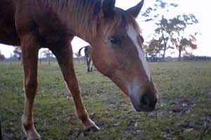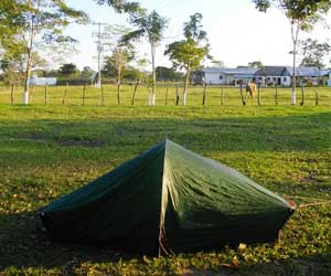 そんなわけで、今日も快調に前進。密林地帯は抜けたのですが、今度は、牧場地帯。道の両側では、牛や馬がのんびりと草を食べているんです。さて、夕刻、今日の宿は・・・と思うも、周辺にはなさそう。しかもしばらく行ってもある気配がない。今日はキャンプかなと思うも、両隣は牧場地帯で、明らかに誰かの土地。さすがに、そういうところに無断で入って勝手にテントを張るのは難しい。そもそも、鉄条網で囲まれているから入ることすら難しい。どうしようかなぁと思っていたところ、ある牧場に車が入っていくではないですか。こ、これは、チャンス!この人にお願いして牧場内にテントを張らせてもらおう、と捕まえて交渉。意外とあっさりOKしてもらえ、無事今夜の寝床確保。馬がいる牧場にテントを張る。と、テントが珍しいのか、馬がテントに寄ってきた。しかも1頭ではなく7~8頭くらい。10分位ジーっと見ている。ち、近い・・・テントの外で涼んでいた僕は動くに動けない。あぁ、結構シュールないい場面なのに、カメラはテントの中・・・手元にあったPalmで写真をとったのだが、ここはデジカメでも撮っておきたいと、カメラを取りにテントに入った瞬間、馬達は小屋のほうに走り去っていってしまいました・・・