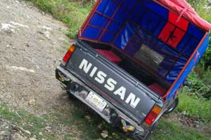 San Cristbalまでの約100kmの道のり、なんとか今日中にたどり着こうと朝いつもより早めに出発したのですが、ひたすら続く登り坂で、自転車押しがメインとなってしまった移動では、全然距離がだせない。16:00を回った時点であと40km・・・どこかでキャンプかなと思った矢先に、目の前にNISSANの軽トラックが止まったんです。この山道、NISSANの軽トラックが頻繁に通っておりまして。幌がついたこのトラックは、実は乗り合いバス。ちょうど、お客が降りたところで、後ろの荷台が空になったトラックが目の前に。いいタイミングで目の前に現れたというのもあり、この際、乗っちゃおうという気になりまして。San Cristbalまで、自転車ごと乗っけてもらうことにしました。
