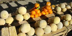 村に入ると、先住民の人たちがいっぱい。市場が一番賑わっている村の中心広場に向かおうとすると、自転車ではとても入れないくらい人で溢れている。しょうがないので、近くの売店に自転車を置かせてもらい、カバン一つで広場へ。教会前の広場は、出店でいっぱい。食べ物売りが一番多いですが、装飾品類、日用雑貨などありとあらゆるものが並べられている。食べ物は面白い積み方でならべられてました。ついつい目がいっちゃうよなぁこれ。アイキャッチの方法としてはなかなかです。また、道には独特の衣装を着た先住民の人たちが歩いていて、それを見ているだけでも楽しい。