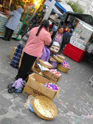 さて、今日、朝食を食べていると、チニータとラウラが起きて食堂に来た。「Buenos dias、チニータ、ラウラ」「Buenos dias, Yoshi」いつもの挨拶なのだが、ん、いつもと雰囲気が違う二人・・・そう、今日はえらいおめかしをしていたんです。聞いてみると今日はなにやら特別なお祝いの日らしい。卵の中身を抜いて殻だけにしたものに色づけしたカスカローネスというものを、人の頭にぶつけてよいという無礼講が許されるフィエスタだという。カスカローネスは、広場に出ている屋台でたくさん売っている。通常版は中身を抜いた殻だけなのだが、特別版は、ご丁寧に、中に石灰の粉が入っていて、これをぶつけられると、頭が真っ白になるのだ。