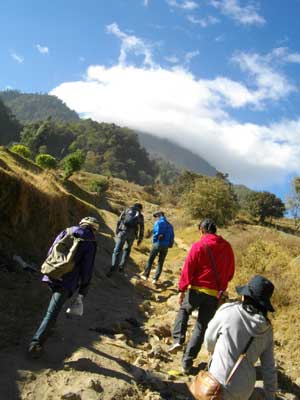 口論は折り合いがつかず、長期戦の模様。スペイン語で、口論できるのはタカさんだけ・・・他の僕らは、居ても傍観するだけだったので、タカさんが「長くなりそうだから、先に登ってて」と。この場はタカさんに任せて、登ることに。が、やはり心配だったので、途中で待つことにしたのだが、タカさんはなかなか来ず。展望台のある頂上あたりに雲がかかってきて、多分登っても今日は見れないだろうということもあり、ふもとまで戻ることにした。