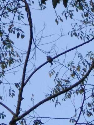 せっかく来たのに、このままケツアールが見れず終いか・・・ケツアールを見るのは6:00~7:00が勝負だという。7:00を過ぎちゃうと、また山の上のほうに去っていってしまうらしいのだ。刻一刻と時間が経っていく・・・じぃっと木の上を眺めていると、枝を移るために飛び立った鳥を発見。ようやく姿を確認できたその鳥が、飛び立った先の枝にとまっているところを激写。が、この鳥、それっぽいのだが、尾が短い。僕の中でのケツアールのイメージでは、優雅なほど長い羽の尾を持っているはずなのだが・・・うーん、この鳥はケツアールじゃないのかなぁと思い、朝食準備をしていた宿のおばさんに、先ほど撮った写真を見せたところ、「ケツアールよ、これ。胸にエンブレムが見えるでしょ」と。おぉ、よかった!実はこの写真を撮るのに、1時間くらい上を見上げていたのだ。苦労が報われたというもんだ(涙)。その後、2羽ほど、ケツアールらしき鳥の姿を確認。でもいずれも、相当高いところを飛んでいたため、うまく写真に撮れず・・・いやぁ、バードウォッチングには超望遠レンズが付くカメラが必須ですな。コンパクトカメラでは撮りきれません。