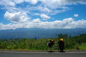 そろそろ山の高度も下がってきて、下りが多くなってきた。緩やかな下り坂が続き、かなり気持ちよい。今まで、憎し、と思っていた背景に見える山々の風景もなんだかおいらの旅を祝福してくれているような、そんな気分。いやぁ、自転車旅行での気分は、道の状況に応じてコロコロ変わるもんです。