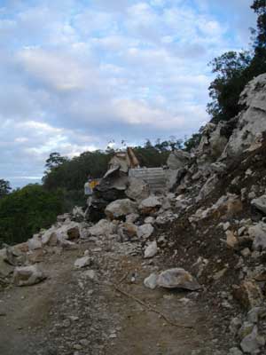 さて、途中、何台もの車に追い抜かれていったのですが、それらの車がなぜか、列を作って停車している。むむ、これはひょっとして事故か?と思ったら、どうやらまたがけ崩れらしい。列の先頭に行って、見ると、「自転車はOKだよ」と。この自転車はOKという言葉、この間の件があったので、本当?と思ったのですが、今回は、回り道はなく、ただ待っているだけになるので、それならば、少しでも進んでおこうと、前に進む。行く手には次第に、工事車両が増えてきた。どうやら道路工事をしているらしい。ダイナマイトでの爆破音も聞こえる。がけ崩れって、ダイナマイトの配分を間違えて、人為的に起こしちゃったんじゃないの?と思いつつ、進むと、岩で道が完全にふさがれている地点に到達。今回のは、前回のほど派手ではなく、岩が道をふさいじゃっている程度のがけ崩れ。岩を乗り越えれば、人は歩いて通れる。しょうがないので、自転車の荷物を一旦解き、5往復くらいして、荷物&自転車を向こう側へ運ぶ。と、おいらが運んだ直後に、ショベルカーが来て、道をふさいでいた岩の除去作業に。うーん、もうちょっと早くやってよぉ。