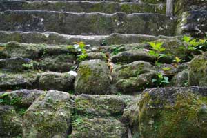 さて、ティカル遺跡、一号神殿、二号神殿がそびえ立つグラン・プラザという広場が中心になっている。まずここに訪れ、そして、次に失われた世界、7つの神殿の広場と見ていったのだが・・・密林と遺跡のバランスが、僕が想像していたマヤ遺跡のイメージとピッタリなのだ。子供の頃に埋め込まれた記憶って、いつの間にやら自分の中で美化されてしまって、現実のものとは違ったものになってしまい、結局辿り着けない(たとえ、そのものに出会ったとしても、<これは違う>と思ってしまう)ことがあると思うんです。昔食べたたこ焼きの味に巡りあいたくて、たこ焼きを食べ歩くも、あの味には辿り着けないっていう、あの感覚。今回も、メヒコからずっとマヤ遺跡を見てきて、あぁ、結局イメージしているマヤにでは辿り着かないのかなと思っていたのですが・・・あぁやっと出会えました、ここで。もちろん、ピッタリといっても、ある一パーツだけ欠けている点があったのが残念。そのパーツとは・・・おいらのイメージでは、太陽の石のような巨大な丸い石壁が密林の中に埋もれているイメージがあったんです。こいつはどこを探しても見つかりませんでした。まぁもっとも、こういう石壁類は全部博物館に行っちゃうでしょうから、現物として、遺跡の現場にそのまま置かれているはずはないんですけどね。