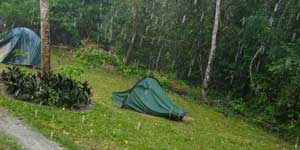 さて、お昼を過ぎると、人がすごく増えてきた。朝ほとんど人がいなかったグラン・プラザにもう一度行ってみると、ヒトでいっぱい。8時間くらい遺跡を堪能し、気持ちがいっぱいになったおいらは、そろそろ出発しようと、宿へ戻ることに。途中で軽く昼食を食べていたら・・・あっという間に空が暗くなって、ザーという音と共に、土砂降りの雨が!おぉっと、テントがずぶ濡れだと、慌てて宿へ戻り、テントを見てみると、とりあえず、居間に当たる中の部分までは水は浸透していないのを確認。土間に当たる外と中の中間部分に置いておいた荷物が危ういので、宿の中に退避させてもらうことに。あぁ、それにしても、ここの天気はホント気まぐれだ。それにこの降水量。この辺一体が木でいっぱいになり、ティカルが密林に埋もれたのも分かるような気がしました。