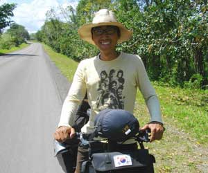 昨日、ティカルを出発間際に、アジア系の男の人に声をかけられたんです。日本人かな?と思って話してみると、韓国の方。どうやら、彼も自転車で中米・南米を旅行中らしく、自転車に乗ったおいらを見て声をかけたというわけなんです。そんな彼、フローレスに宿をとってツアーでティカルまで来て、明日またフローレスに戻るという話をしてまして。だったら、明日、フローレスでまた会えるかもね、なんて話をしていたのですが、今日、僕がフローレスへ向かう途中に、ベリーズに向かって走る彼の自転車とばったり遭遇。いやぁ、こういう出会いは嬉しくなっちゃいます。これからベリーズに行って、カンクンからキューバに飛んだあと、ベネズエラへ入るという彼とはきっとまた南米で会える気がします。