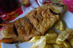 さて、湖沿いの道を走っていると、おそらく今朝釣り上げたのであろう魚を売っている出店(?)に遭遇。魚を何匹もぶら下げた出店なのだが、こういった出店が20軒くらい軒を並べている。これを見て、すっかり魚を食べたくなってしまったおいらは、昼食を食べに入った店で、Pescado Frito(魚のから揚げ)を注文。久々の白身魚、旨い!ボリュームもあって、満足満足。