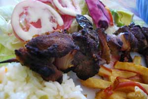 そろそろ、ホンジュラスともお別れ。順調に行けば、明後日にはニカラグアに入国しているかな。で、大事なことを忘れてました。ホンジュラスの代表的な肉料理<ピンチョ>をまだ食べていなかったのです。ピンチョとは、肉と野菜(ピーマンや玉ねぎ)を串刺しにして焼いた、バーベキュー料理。今日の昼に入ったレストランで、ようやくピンチョにありつけまして・・・まぁ、カルネアサドという焼肉料理を串刺しにしただけのものですね。が、朝食を7:00に食べたきり、ひたすら自転車をこいで空腹の状態で、14:00にレストランに入ったからという、なんでも美味しく感じるぞモードであったため、これが旨いのなんの!食べながら、幸せ過ぎて、涙がこぼれましたよ、これホント。