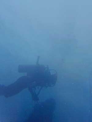 さて、本日一本目のダイブ。船からのバックロールによるダイブインは初めてだったので、ちょっと緊張・・・海に入り、いざ潜ろうとすると、も、潜れない・・・16ポンドのウェイトを着けているのに沈まないのです。以前堀さんにメールでもらったアドバイスに従い、スーツの空気を抜き、身体を動かさないようにしたにも関わらず・・・しょうがないので、さらに2ポンドウェイトを追加してもらい、ようやく水の中へ。