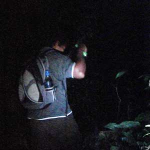 さて、せっかくここに半日残ることになったのだから、もうちょっとジャングルを楽しむことに気分を切り替えまして。災い転じて福となす。せっかくオサ半島に来たんだから、ジャングルをもっと満喫しておきたかった、と心残りがあったのが正直なところ。もう一晩ココに居られることに逆にホッとした自分がいたのです。で、この時間からもジャングルを楽しめる<ジャングルナイトツアー>なるものに参加することにしました。夜行性の動物や昆虫などを見ることができるかも、というこのツアー。3時間くらい夜のジャングルをトレッキングするというものなんです。ガイドのペドロさんと二人で、真っ暗なジャングルの中へ・・・いやぁ、やっぱりネイチャーウォッチングというのは難しいもんなんですねぇ。夜のジャングルはいろんなものがウゴウゴしているのかと期待していたんですが、意外と静かなものでして。動物はおろか、虫を見つけるのも難しい。長靴で水の中をジャブジャブ進み、木に頭をぶつけ、なんとかお目当てのPoison Frogを見ることが出来まして。また、オセロットとかいう動物を木の上に発見。暗い上に遠いので写真にはまったく写らなかったのですが、木の実を食べていて、ライトを照らすと、その木の実をこちらに投げてきたりして。なかなか楽しいジャングルナイトツアーでした。