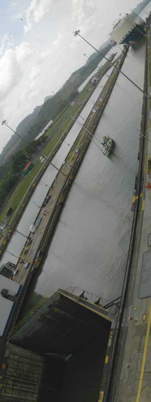 パナマ運河はなぜ水位を調整する水門式の運河なのか?太平洋とカリブ海の水位ってそんなに違うものなのか?と疑問があったのですが、どうやら、水位が違うのは、パナマ内陸にあり、運河の一部となっている湖の水位が高いからのようです。例えば、運河の真ん中あたりにあるガツン湖は、水位が海抜26mの高さにある。このため、太平洋側、カリブ海側の両方で水位調節の水門が必要となるそうなんです。それにしても門通過の度に、1.97億リットルもの水が使用されるとは・・・聞いてもピンとこないほどすごい水の量だ。