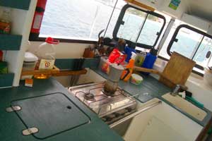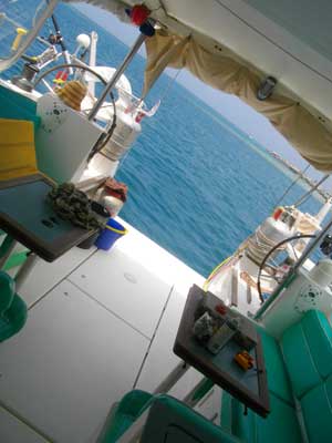 キャプテンはどんな人なのかと、ドキドキしたのだが、キャプテンフェルナンドはグッドガイ!敬礼の挨拶で迎えられた。ちょっと照れくさいほど大げさなアクションをする人なのだ。そしてもう一人、ホセさんという男の人が乗っていた。この人は客ではなく、別の船のキャプテン。彼の船がポルベニール島に停めてあるので、そこまで一緒に行くとのこと。で、他の客は?とキャプテンに聞くと、「客はキミだけだ」と。そして、「サンブラス観光は短縮してダイレクトにカルタヘナに向かうことにしたから・・・値段はまけて300$でいいや」と。実は、パナマシティの宿で交渉した際、4泊5日うち2日はサンブラス諸島を遊びながらクルーズで、375$ということだったんです。それが、サンブラスは一日寄るだけという予定になり(一日、あなたが遅れたからでしょ)、値段が300$になったというわけです(ただし、宿でデポジットとして20$払っているため、実質320$)。ちなみに、この値段、食料、水、イミグレ手数料すべて込みの値段です。