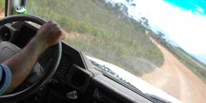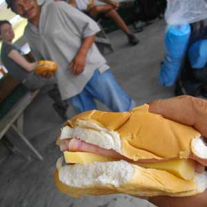 今回の登山パーティは全部で8人。ガイドのホセと、ポーター(食料や細々とした必要品を運ぶ人)のチグリ、そして、オイラ、フランスのヤジータ、ブラジルカップルのジョーとジュリアン、オランダのサンダーに、アイルランドのキャロル。ロライマへの登山口へはサンタエレナより、60kmほど手前にあるサンフランシスコという町からの方が近い。一旦サンフランシスコに戻るようなカタチになり、ロライマへ向かう。未舗装のガタガタ道をジープで走ること1時間くらい。パライテプイという場所でジープを降りる。どうやらここから歩きになるらしい。昼食のサンドイッチをほおばる。パンにハムとチーズが挟んであるだけのそっけないもの。うーむ、飯はあまり期待できないかも・・・
